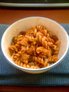 Dreamfields pasta with broccoli, mushrooms, tomato sauce, Parmesan, and mozzarella.